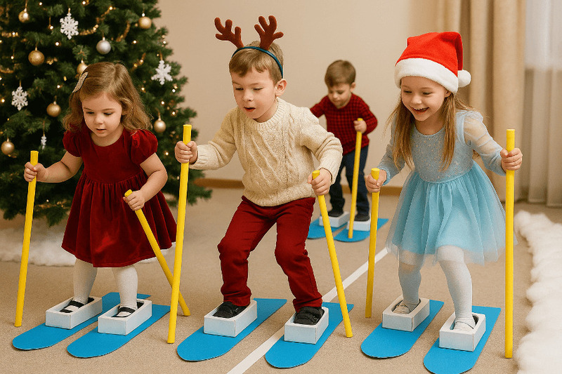 Для конкурса достаточно сделать две пары лыж — по одной на команду. Палки делать необязательно, но если есть желание, их можно смастерить из жестких труб ПВХ и обклеить тканью или яркой упаковочной бумагой. Источник — ChatGPT-5