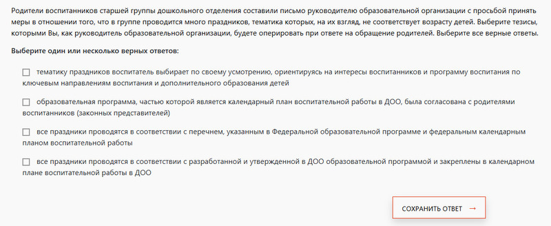 Тестирование состоит из нескольких модулей и проверяет знания по управлению ресурсами, кадрами, процессами, результатами и информацией. Вопросы формируются так, что невозможно заранее выучить все ответы. Нужно хорошо владеть нормативно-правовой базой, знать стандарты и постановления, уметь пользоваться ими, чтобы решить конкретную задачу. В течение 60 минут кандидат отвечает на вопросы с выбором из нескольких вариантов и со свободным ответом.