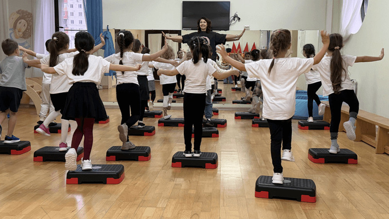 - В средней, старшей и подготовительной группе занятия продолжаются по 30 минут: к аэробике добавляем упражнения на степ-платформе для детей.