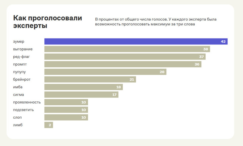 По версии портала «Грамота.ру», словом года стало «зумер». Это название поколения Z — людей, которые выросли уже в цифровой среде. Интерес к слову резко вырос, потому что зумеры вышли на рынок труда, стали заметны в экономике, культуре и общественной жизни. Вокруг этого поколения есть много мемов, их обсуждают, высмеивают, сравнивают с миллениалами.