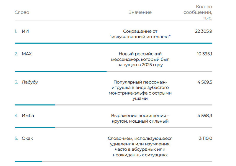 Топ-5 самых популярных слов 2025 года по упоминаемости в соцсетях. Источник — Медиалогия