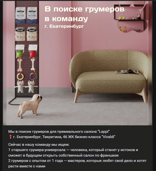 Вакансии часто размещают в группах или чатах по интересам — можно вступить в них и следить за новостями. Источник — группа VK «СООБЩЕСТВО ГРУМЕРОВ , ГРУМИНГ»
