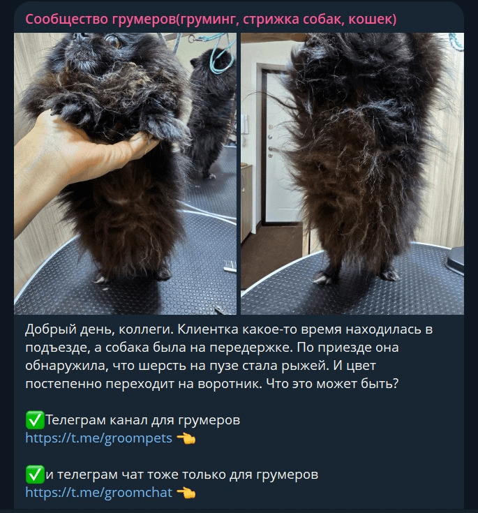 Спросить совета опытных коллег можно в соответствующих интернет-сообществах. Источник — телеграм-канал «Сообщество грумеров (груминг, стрижка собак, кошек)»