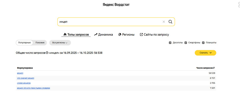 Тема инцелов вызывает заметный интерес: более 56 тысяч поисковых запросов. Источник — Яндекс Вордстат