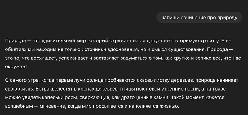 - Стерильный текст без ошибок. Школьные работы почти всегда содержат неточности: где-то пропущена запятая, где-то повторилось слово, где-то мысль звучит неровно. В тексте нейросети таких «шероховатостей» нет. Она пишет гладко и безупречно, но именно эта безупречность и настораживает.
