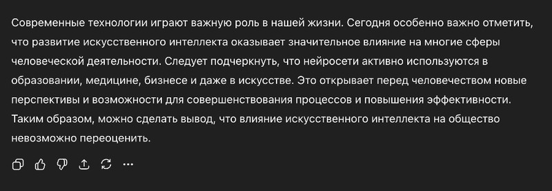 Несмотря на объем, в тексте отражена только одна мысль: искусственный интеллект влияет на разные сферы жизни. Источник — Chat GPT