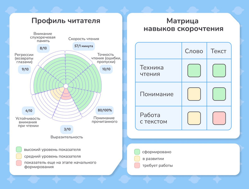 Такая обратная связь превращает обучение из хаотичного процесса в управляемую систему развития ребенка с понятными результатами. Источник — материалы по курсу «Скорочтение»