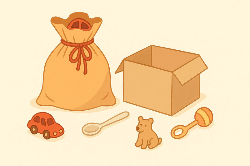 «Пакет с сюрпризом». Нужен непрозрачный мешочек или коробка и несколько небольших предметов: машинка, ложка, фигурка животного, погремушка. Логопед слегка встряхивает пакет, дает ребенку подержать, подносит ближе. Затем достает один предмет, показывает малышу и делает с ним простое действие: машинка едет, ложка кормит игрушку, зверек прыгает.