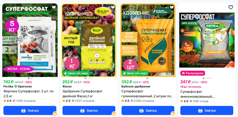 Суперфосфаты и другие минеральные удобрения продаются на маркетплейсах. Источник — Wildberries