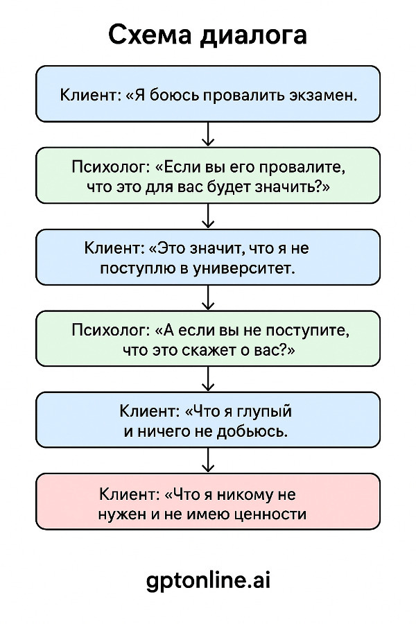 Понять логику клиента. Через серию вопросов психолог узнает, почему именно эта мысль или ситуация вызывает сильную реакцию. Например, два студента боятся экзамена: один — из-за страха перед сложными вопросами, другой — из-за убеждения, что любая неудача доказывает его «никчемность». Без техники они звучали бы одинаково, но корни проблемы совершенно разные.